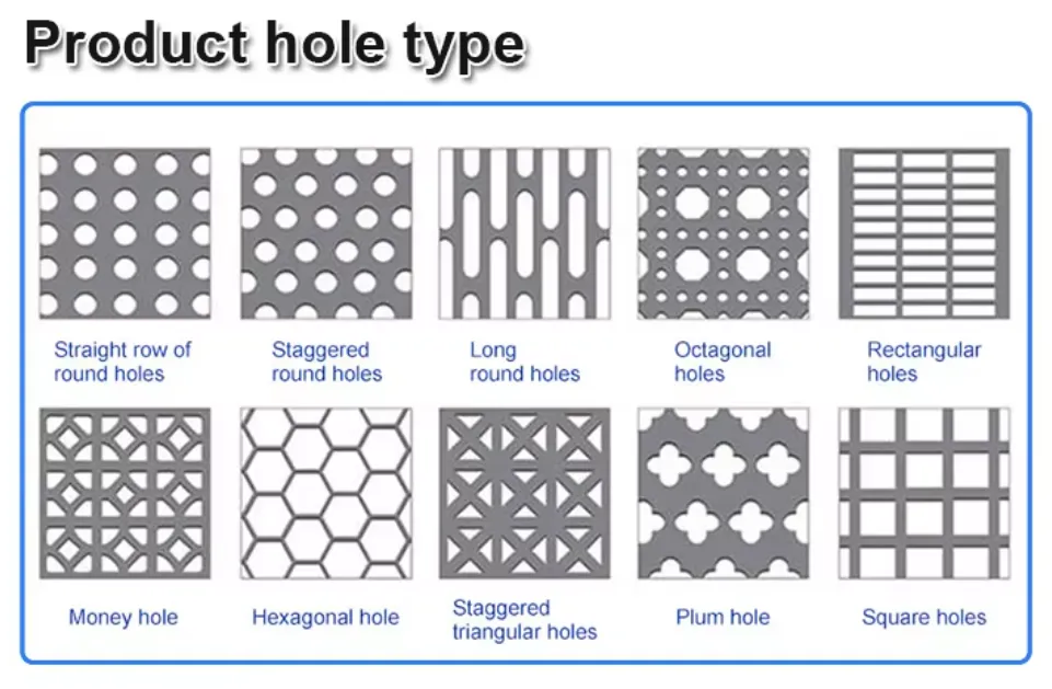 Perforated Hole type: round hole, oval hole, square hole, diamond hole, triangular hole, cross hole, hexagonal hole, plum blossom hole, fish scale hole, long waist hole and other holes can be customized.Perforated Specifications